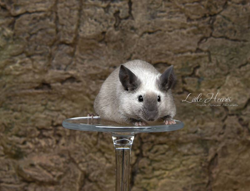 Pearl (pe) - Augen schwarz. Eine Perlmaus hat ein helles Silber, dessen Unterfarbe ins Weissliche übergeht. Jedes Haar ist mit zarten grauen oder schwarzen Spitzen versehen und verläuft über Kopf und Bauch.